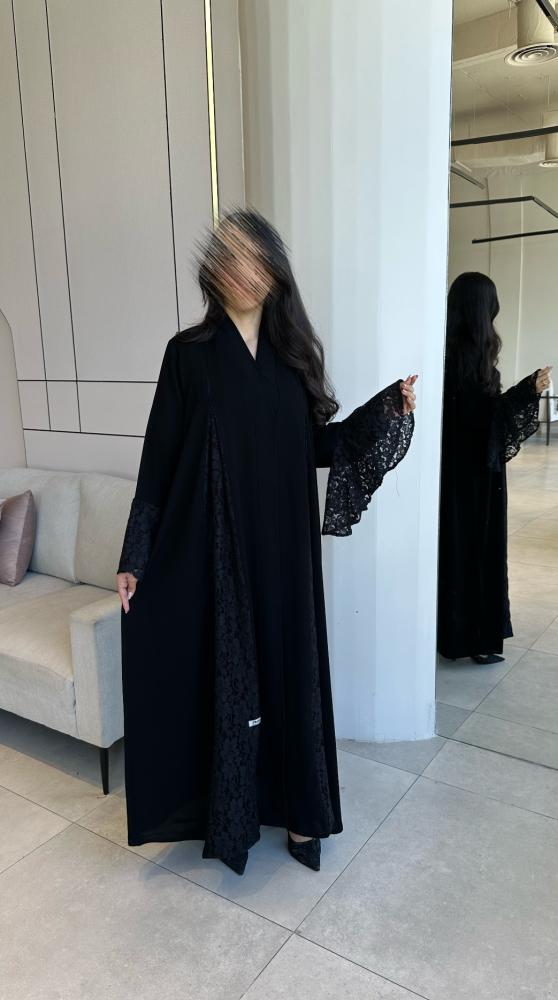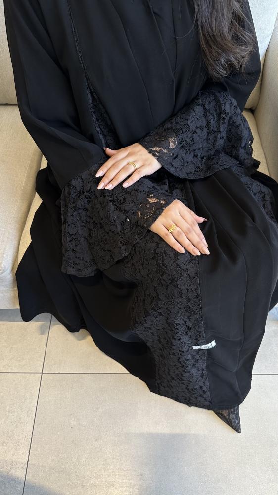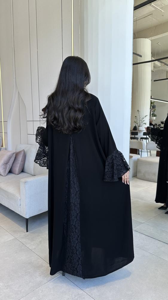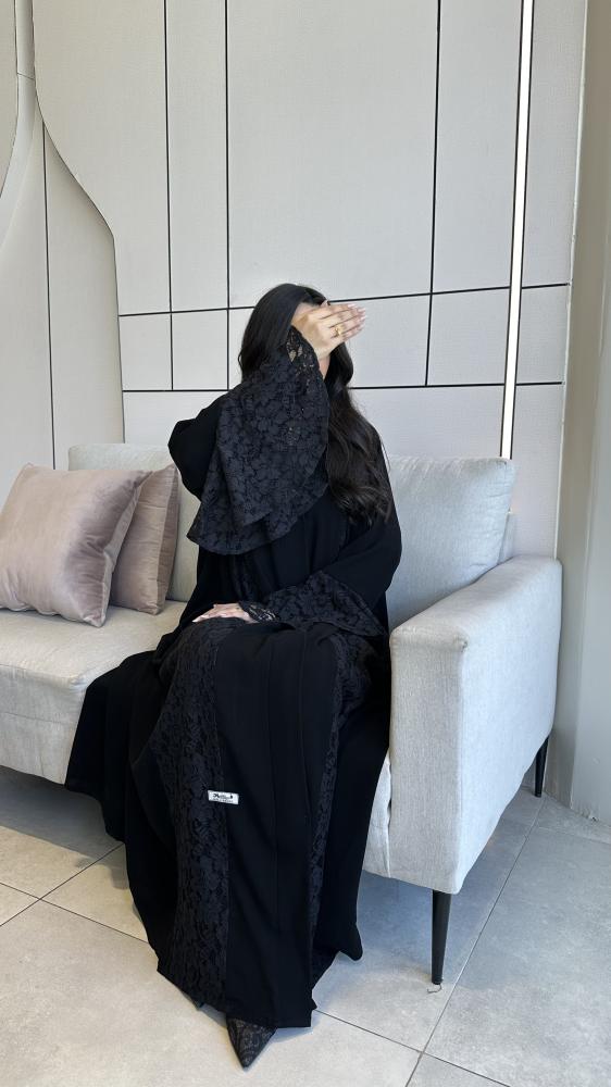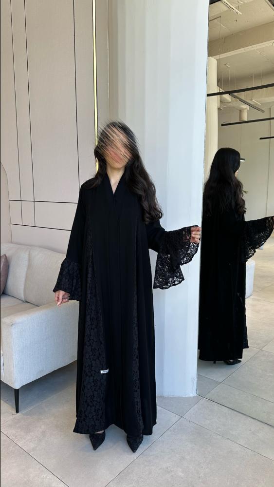 عباية غنج من كولكشن موج الجديد صُممت بقماشها الكريب الملكي الفاحم بأكمام وكسرة من الخلف من الدانتيل الراقي والانيق تتناسبك مع مناسباتك الفخمة والخاصه .