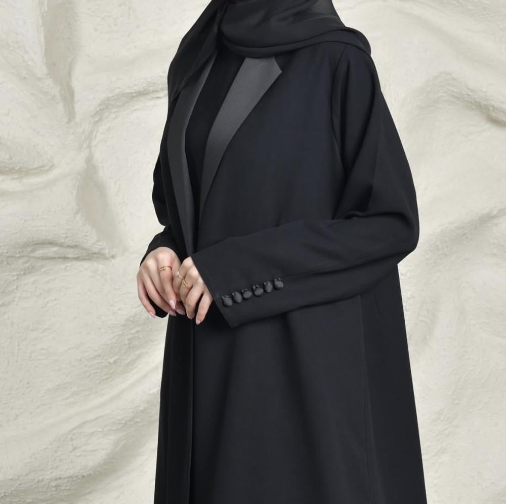 عباية ليلى بقماش كتان واقف وبياقة من الستان انيقة وعملية تناسب اوقات عملكِ الطويله